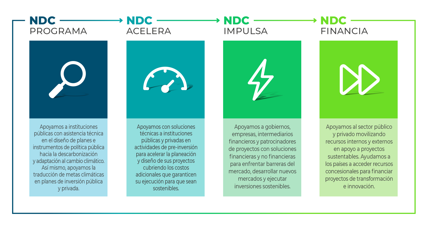 Para apoyar a los países de nuestra región, hemos creado NDC Invest, una plataforma donde ofrecemos soluciones financieras y apoyo técnico para ayudar a construir las metas nacionales y transformarlas en planes alcanzables que generen economías prósperas, resilientes y de carbono neutral para el 2050.